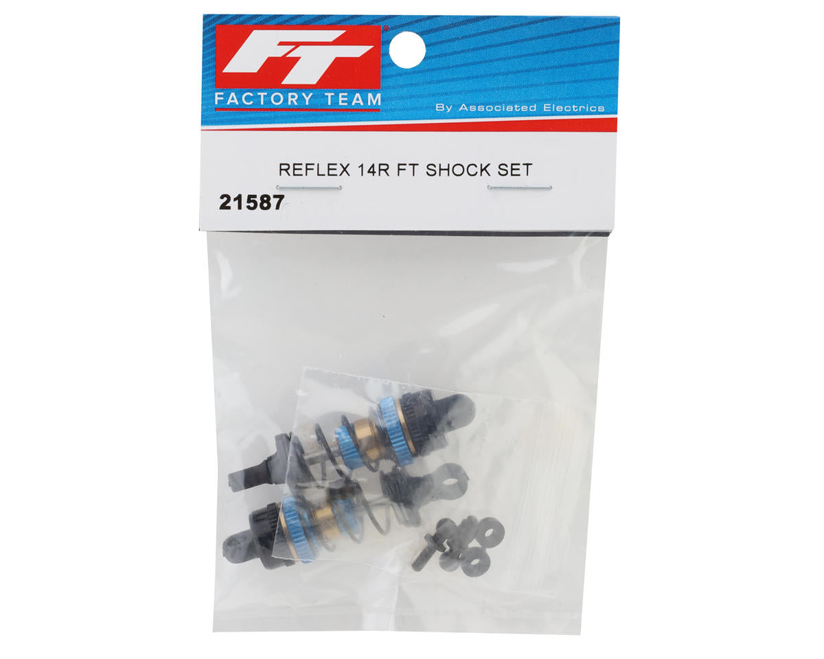 Team Associated Reflex 14R Factory Team Assembled Shocks. These optional shocks offer smooth, consistent performance for the Reflex 14R. Using aluminum anodized shock bodies, lower caps and spring adjusters these shocks hold up under high stress situations and keep performing run after run. Package includes two pre-assembled shocks, two ball studs, two spacers and two hollow ball inserts.