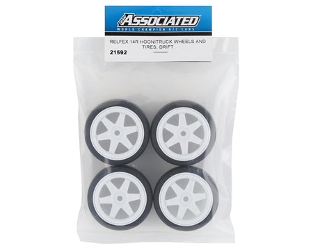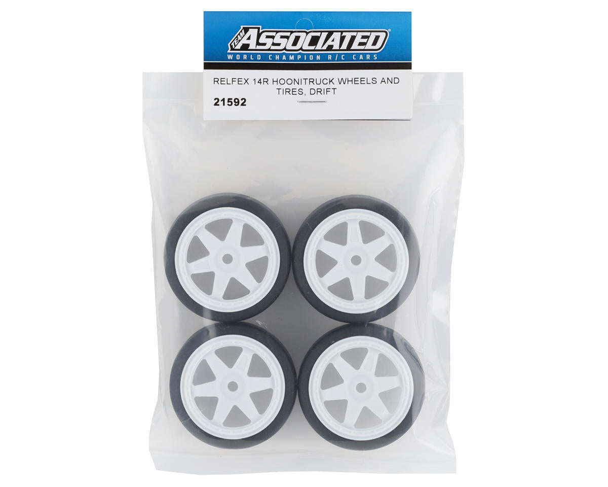These are the Team Associated Reflex 14R Hoonitruck Pre-Mounted Drift Tires. These optional pre-mounted tires are intended for the Team Associated Reflex 14R Hoonigan platform to allow your Reflex 14R Hoonigan to do some Hoonigan sideways action. Package includes four Reflex 14R Hoonitruck pre-mounted drift tires.