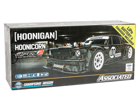 The Team Associated Apex2 Hoonicorn RTR Combo brings to life one of the most iconic cars Hoonigan has ever came up with. The Hoonicorn quickly became a fan favorite with it's classic Ford Mustang looks, huge twin turbo horsepower and tire slaying AWD performance. Team Associated has captured the soul of this vehicle with scale body details like the American Racing VF503 Wheels, rear diffuser, molded intake and turbos, scale brake rotors, and more! Paired up to the Apex2 chassis this vehicle packs some potent performance just like the real thing. The Apex2 chassis uses front and rear independent suspension, threaded oil-filled shocks, active rear toe and sealed gear differentials. With stout drivetrain and the awe-inspiring Hoonicorn licensed body it's time to add this pony to your stable.