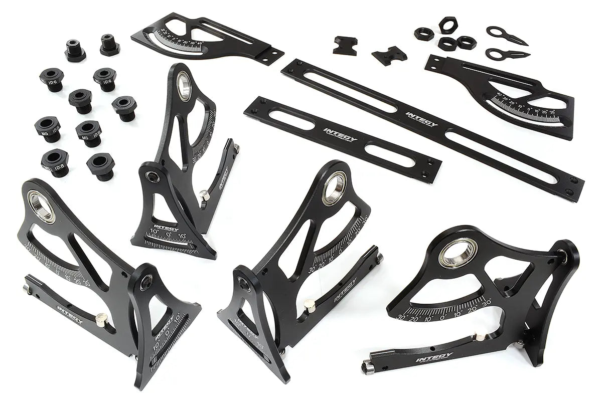If you have ever been to a race track you will know that proper chassis setup is critical, and can be the difference between a DNF and a checkered flag. for most 1/10 and 1/8-scale GT, buggy, truggy, and monster truck owners we offer our Universal Setup Station . Crafted from aluminum and anodized in a gunmetal finish, the setup station can measure each corner of your vehicle individually - up to 15-degrees of camber, 30-degrees of caster, and +35/-40-degrees of toe. The measuring plates all ride on ball bearings for smooth movement and precise readings.