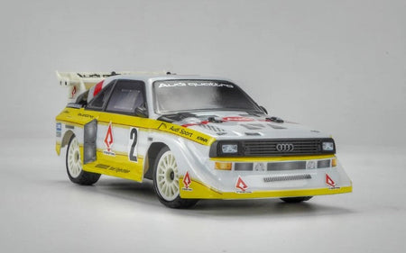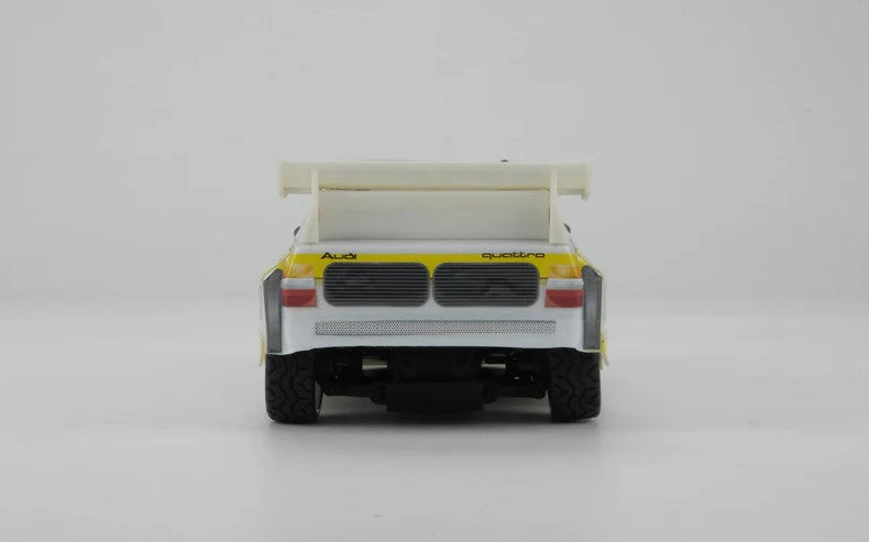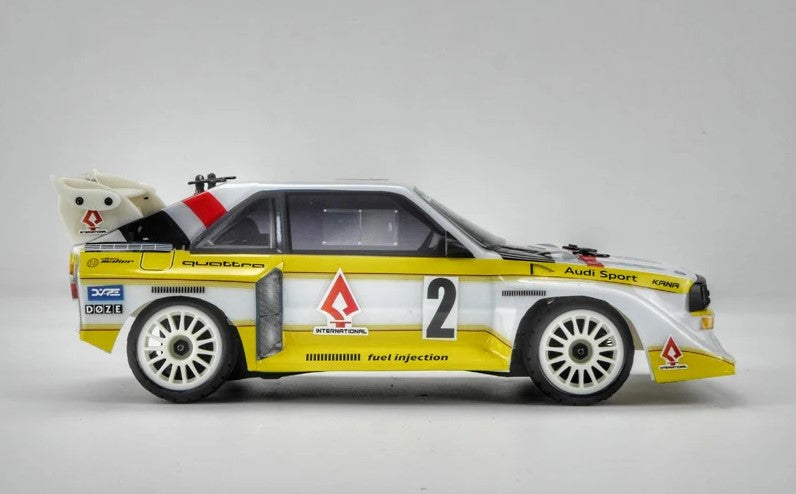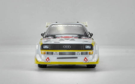 The whole of the body is beautifully reproduced in a lightweight, hobby grade, vacuum-formed body with beautiful decals. The paint scheme is reminiscent of the iconic Audi Quattro Racing colors.