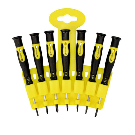 This precision screwdriver set features 4 torx, 2 Phillips, and 1 slotted screwdriver with rubber grips and plastic swivel handles. Screwdrivers are constructed of chrome venadium and have magnetic tips. Set includes a convenient storage hanger.