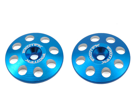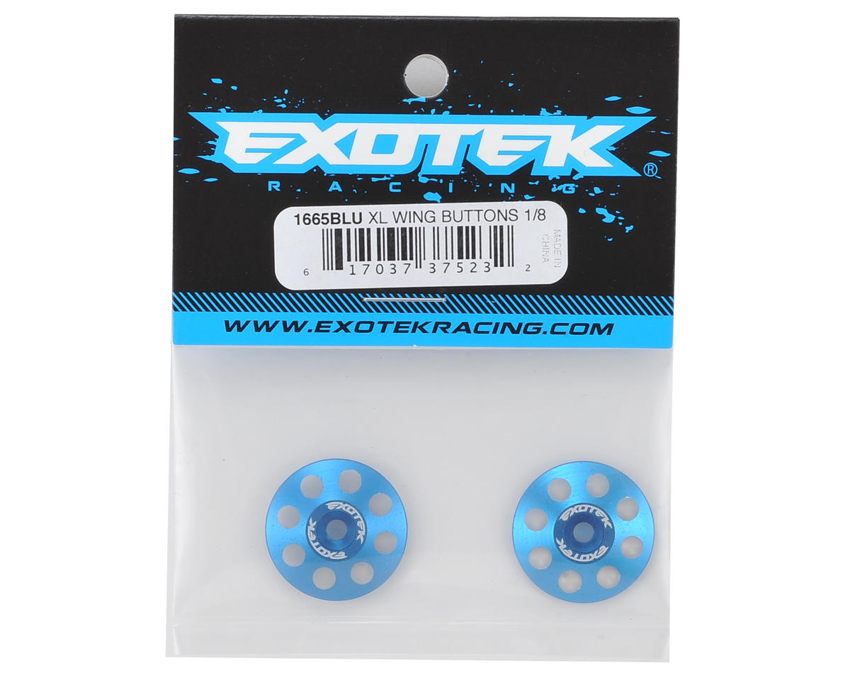 Exotek 22mm 1/8 XL Aluminum Wing Buttons are heavy duty, polished and anodized in a variety of colors to match your factory colors or paint scheme. The extra large 22mm diameter buttons are compatible with screw type wing mounts, and are thicker than 1/10 buttons, providing an incredibly secure hold on your wing and offering protection from crashes.