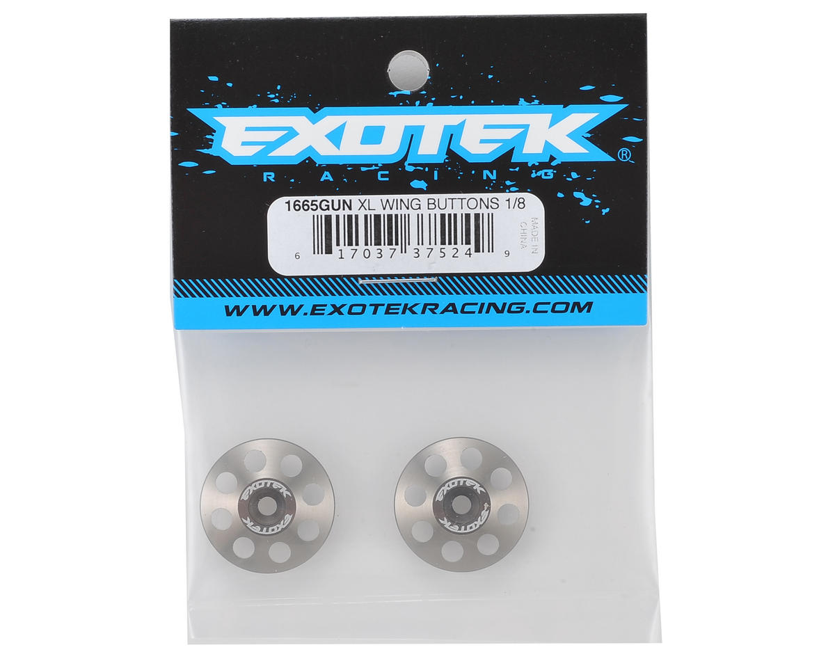 Exotek 22mm 1/8 XL Aluminum Wing Buttons are heavy duty, polished and anodized in a variety of colors to match your factory colors or paint scheme. The extra large 22mm diameter buttons are compatible with screw type wing mounts, and are thicker than 1/10 buttons, providing an incredibly secure hold on your wing and offering protection from crashes.