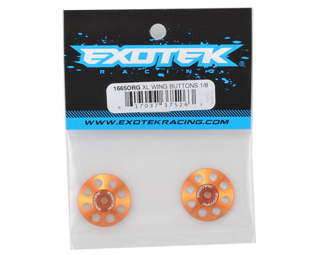 Exotek 22mm 1/8 XL Aluminum Wing Buttons are heavy duty, polished and anodized in a variety of colors to match your factory colors or paint scheme. The extra large 22mm diameter buttons are compatible with screw type wing mounts, and are thicker than 1/10 buttons, providing an incredibly secure hold on your wing and offering protection from crashes.