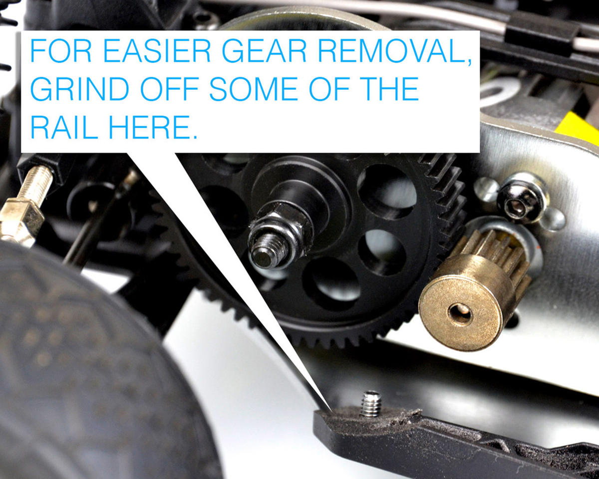- For easier access and clearance, you may want to grind off a bit of the plastic side rail in front of the spur gear
