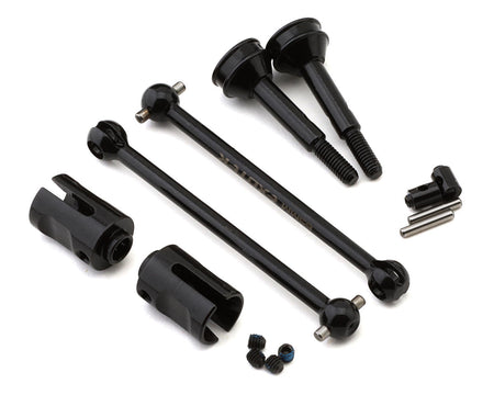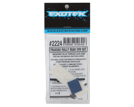 Exotek Traxxas 1/10 Rally HD Rear CVD Axle Set. Constructed from heavy-duty steel with an updated retaining sleeve for improved 2mm pin holding and differential cups that use two set screws to remove slop and reduce vibration, This optional set is intended for the Traxxas 1/10 Rally to boost durability and reliability while reducing overall parts count for quick and easy maintenance process!
