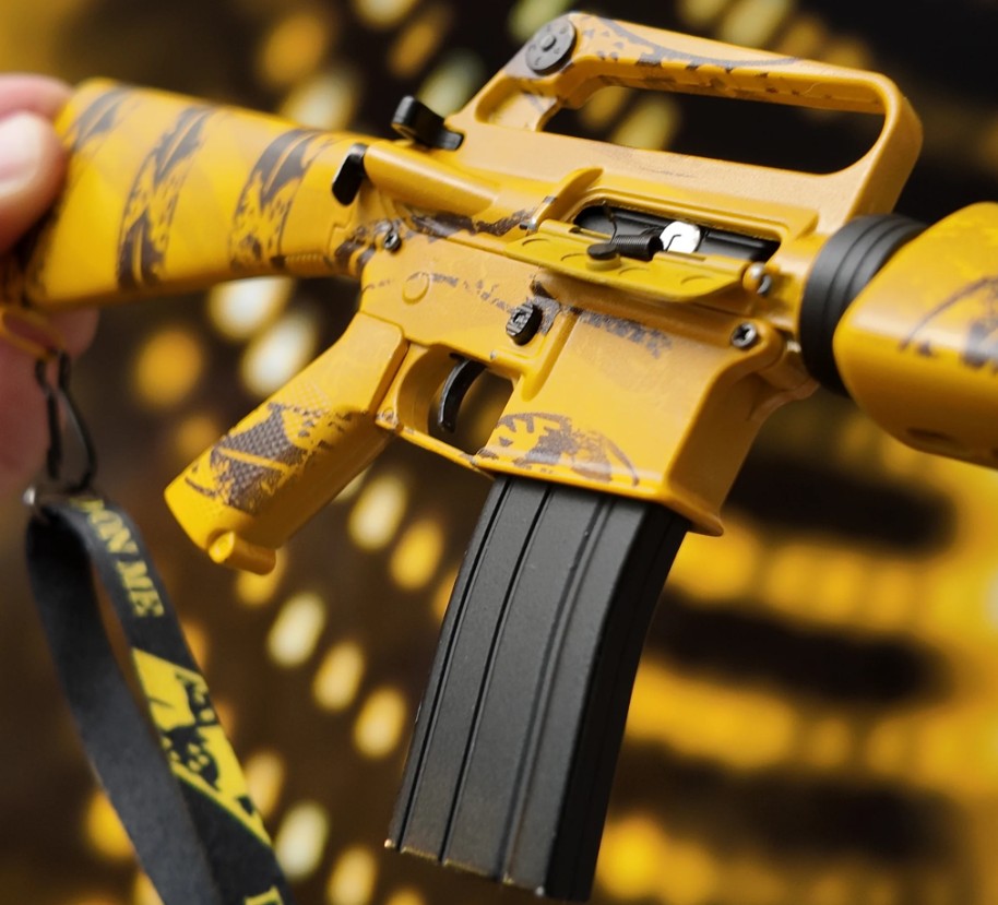 1:3 scale die cast M16A1 Iconic Vietnam War rifle model in a Special Edition "Don't Tread on Me" color way. Comes with 3 dummy rounds and base to rest. It has extended barrel guards, short mag, molded upper receiver with handle.