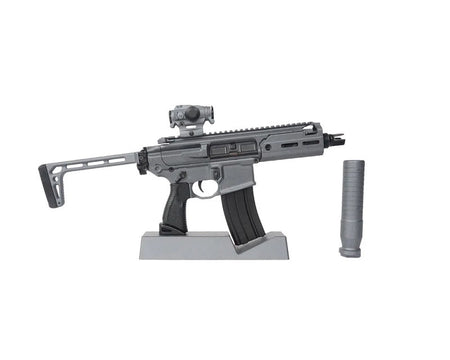 - 1:3 scale version of the SIG MCX done in all die cast metal. A flat stone grey look with offset black parts. Easily twist off the suppressor to reveal the flash hider. Scope adjusts to your liking and you will find the folding stock is quickly addicting.