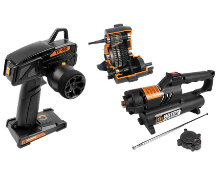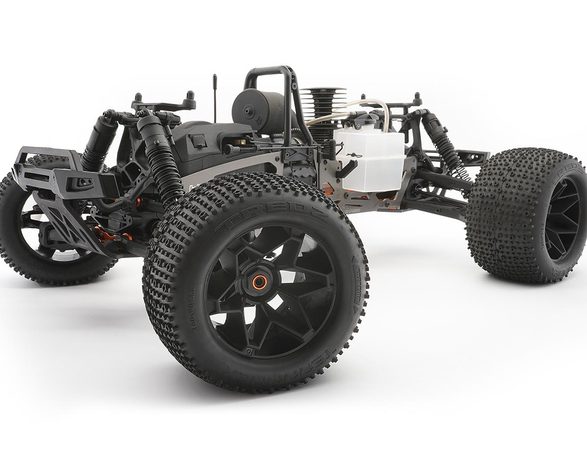 The chassis is built using an extremely durable Twin Vertical Plate (TVP) chassis design. Beefy suspension arms are connected to big bore nylon shocks to allow for a smooth off-road experience. The three-speed transmission is fully adjustable so you can choose how early or late the truck shifts into high gear. Once at high speed, this truck features a dual vented disk brake design that is heat resistant to reduce fade and increase braking performance.