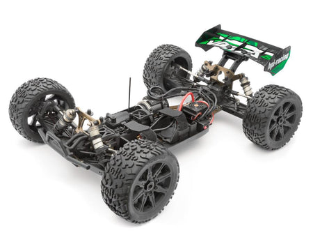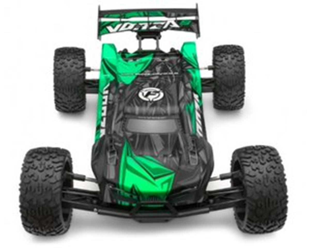 This is the HPI Vorza S 1/8 Ready-to-Run (RTR) Electric Truggy. This powerful 6S capable truggy with all metal drivetrain, sturdy 7075 aluminum chassis, 7075 aluminum shock towers, 7075 aluminum suspension blocks, thick steel turnbuckles and a twin clamp style cast aluminum motor mount so it won't move or shift under the immense amount of torque and ensure a high level of durability and toughness is more than just a great basher. This Vorza S is also ready to race out of the box! All components of the Vorza S drivetrain and electronics are designed to sit flat on the chassis, giving the truggy a very low profile and super low center of gravity for supreme handling through turns and corners. The front suspension features inverse steering blocks, super thick top links, aligned king pin and universal joint driveshafts, sway bar, counter-rotating shock mount screws and aluminum 16mm big bore oil filled shocks with racing tuned springs.