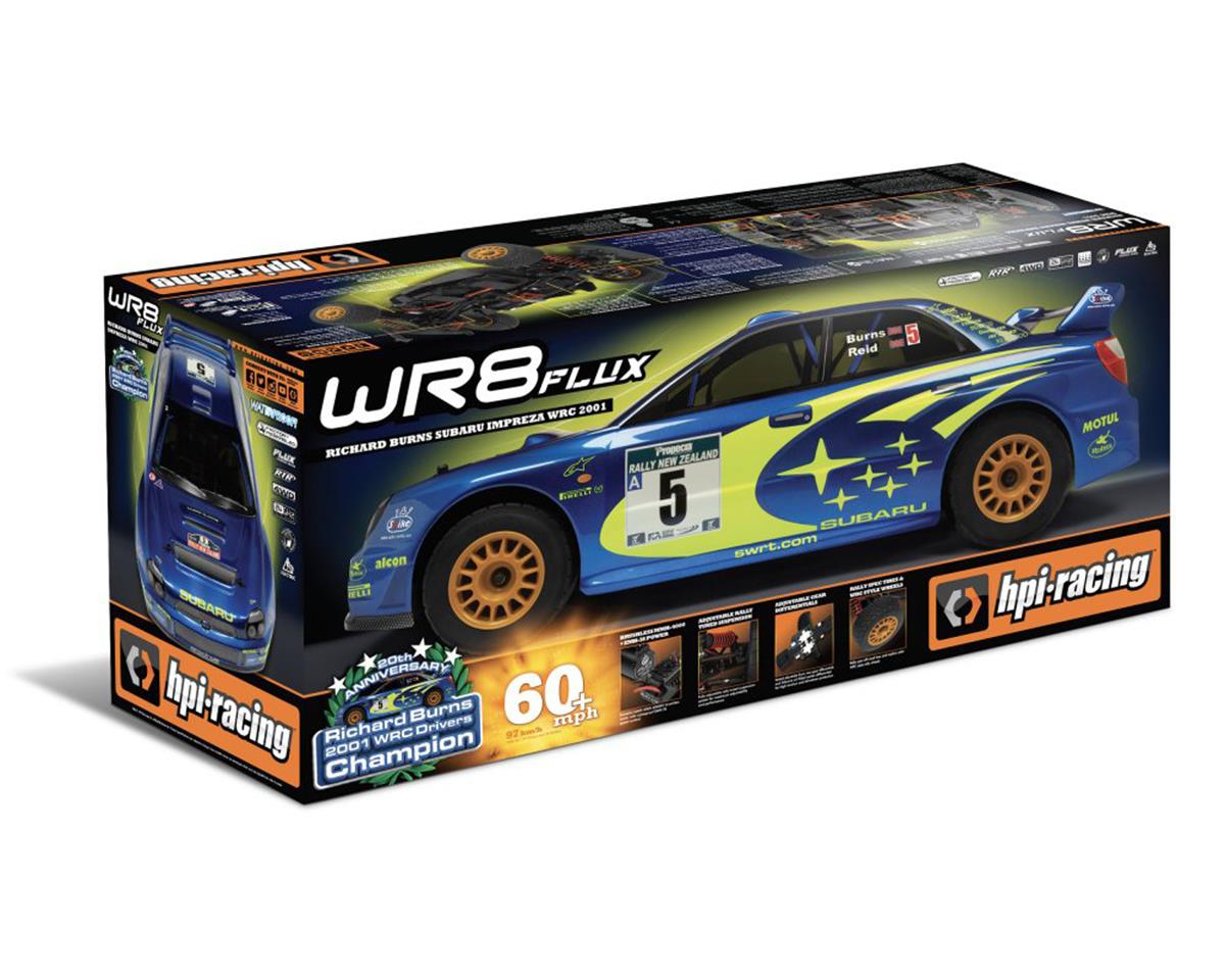 WR8 Flux WRC 2001 Subaru Impreza 1/8 Ready-To-Run Brushless Rally Car Kit. Any rally fan will recognize the illustrious of blue and yellow livery as one of the most recognizable in Rally, and what better way to herald the return of HPI's fan favorite rally platform than with a classic officially licensed 2001 WRC Subaru Impreza!