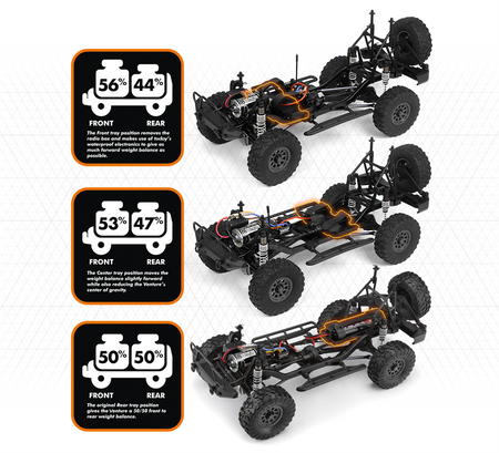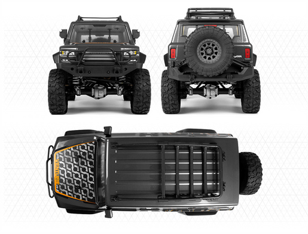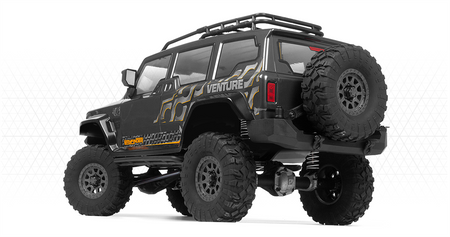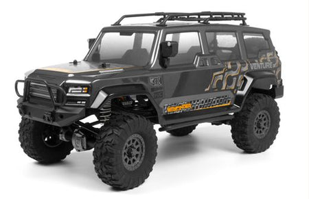 The HPI Venture Wayfinder is an RC trail truck that embodies the spirit of exploration, ready to traverse mountains, streams and beyond. It's not just a vehicle, it's a trusted ally for your weekend jaunts or grand explorations! Combining a realistic front-motor position and formed steel C-channel chassis rails with a realistic suspension and drivetrain results in a unique off-road experience HPI is proud to provide. The Wayfinder body is meticulously crafted in a vibrant metallic Gunmetal featuring black accents that embellish the arch extenders and sills creating a striking contrast. Clear windows provide a realistic look, adding an extra layer of authenticity to the model. With front and rear bumpers, mirrors, a functional roof rack, and a swing-away spare tire mount, the Venture provides an authentic trail experience. Several previous model optional parts are now standard equipment, including the Aluminum lower link set, Aluminum rear 4 link and Universal front driveshafts. The vehicle's performance is further enhanced by authentically scaled oil-filled shock absorbers and full-time locked differentials, and realistically treaded tires, ensuring dependable handling in all off-road conditions.