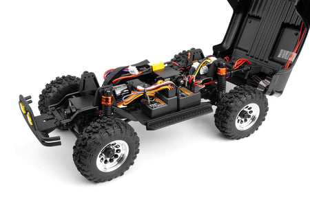 The HPI Venture18 Remote Control Car is a powerful and realistic scale crawler designed to tackle tough terrain with style and precision. Equipped with a 4WD shaft-driven system, it offers excellent traction and control, making it ideal for off-road adventures. Its oil-filled adjustable coilover shocks enhance stability, allowing the car to absorb impacts smoothly, while the sturdy steel C-channel chassis ensures durability under rough conditions. The front and rear feature metal spool differential gears that maintain consistent power to each wheel, complemented by a full metal gear 2-speed transmission that lets drivers switch between crawling and faster speeds effortlessly.