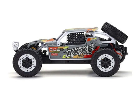 The simple design of Kyosho's electric (EP) 1/10 scale EZ series buggy delivers the perfect combination of handling, high-performance, and affordability. Since its release in 2012, the EZ series AXXE has been a popular beginner R/C car and also a great second car for more experienced drivers. Following its excellent basic design, the AXXE 2.0 has been reborn with upgrades to its standard R/C system components and a modified body for compatibility with modern day power sources. Like its sister model the Sandmaster which was renewed in 2023, the AXXE 2.0 has undergone some changes to its chassis design to accommodate various battery types and to reduce contact of the gearbox with the road surface. The steering servo has also been upgraded to a 6kg high-torque specification that can handle heavy offroad driving loads and the waterproof speed controller (ESC) lets you charge through puddles without a worry. With a new body color scheme, the pipe frame used in real buggy rallies and races combines white pipes with chic gray panels and new decal designs. Sold as a Readyset including body and pre-assembled chassis with R/C system installed, all you need to enjoy R/C car action is a battery for the car, battery charger, and batteries for the transmitter. The simple design structure is easy to disassemble and reassemble, which is optimal for maintenance and tuning.