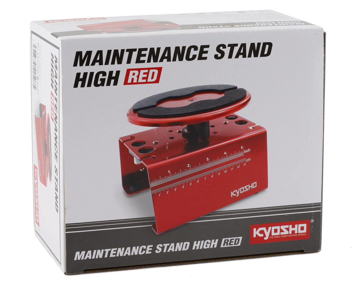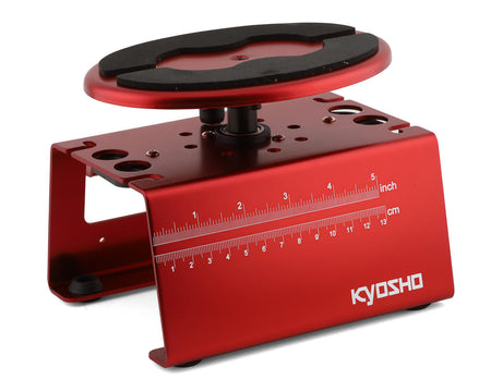 Kyosho Maintenance Stand. Constructed from aluminum and anodized in a beautiful red color, this stand provides a sturdy platform with looks to match. The top of the stand features a bearing supported turntable with a locking mechanism, allowing you to rotate your vehicle and lock it in place. Also incorporated are several tool and part holders for items such as shocks along with an etched ruler for quick length references making this stand an all-in-one solution for your workbench or pit table. Package includes one complete maintenance stand.