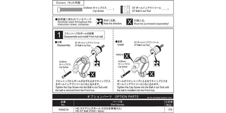 Optional parts for the Fazer MK2 and the FZ02. Convenient tool when installing and removing front hub ball. The ball can be installed straight by tightening the cap screw without damaging the ball, as well as easy removing. Also useful when changing from nylon ball to optional the FAW218 HD ST ball.