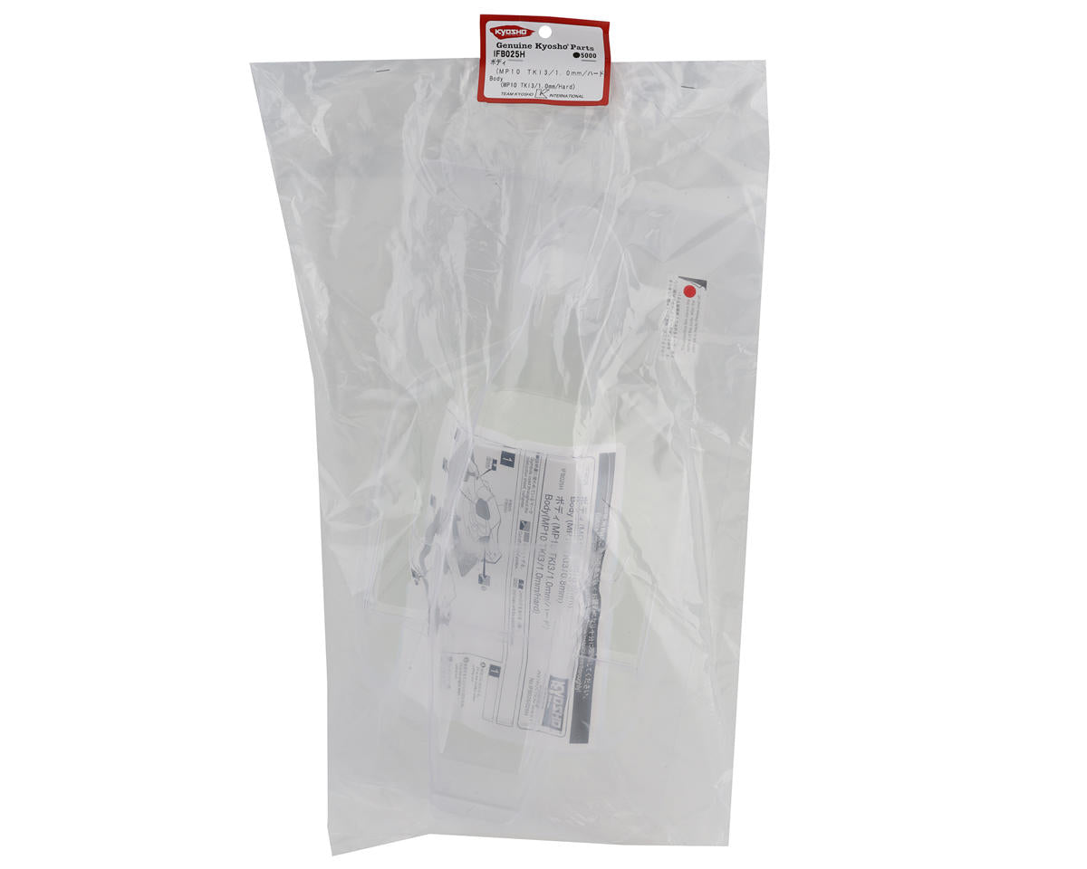 Kyosho MP10 TKI3 1/8 Nitro Buggy Body. This optional 1.0mm thick Lexan clear body is intended for the Kyosho MP10 TKI3 1/8 nitro buggy as a durable option that can hold up to higher impact crashes. Package includes one clear (1.0mm) body with a window mask sheet. (Stock is 0.8mm)