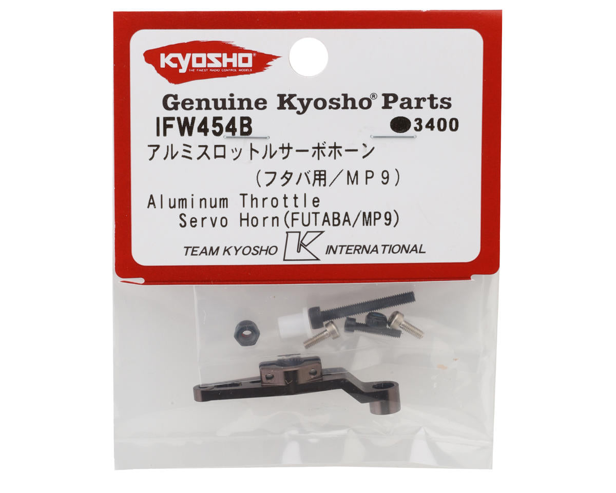 Kyosho MP9 Aluminum Throttle Servo Horn. This is an optional servo horn intended for the Kyosho MP9 platform. Constructed from high grade aluminum this arm features excellent strength and durability along with fitting securely with a clamping spline. The horn is also stepped on the brake side, eliminating the collars that are used to raise the linkage rods. Package includes one 25T servo horn and mounting hardware.