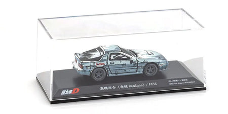 The set includes three popular character's cars: Takumi Fujiwara's AE86/Sprinter Trueno, Keisuke Takahashi's FD3S/RX-7, and Ryosuke Takahashi's FC3S/RX-7 and comes with 4 backgrounds. Each car is housed in a clear case on a special pedestal mount in a specially designed window package so the car can be displayed on its own.