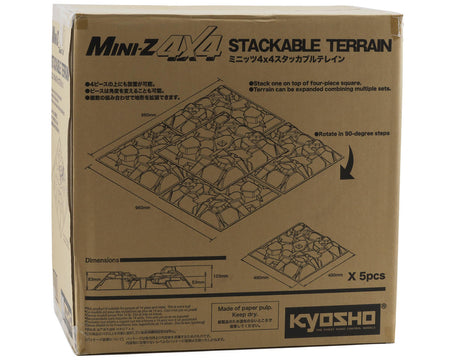 Kyosho MX-01 Mini-Z 4x4 Terrain Plates give you five separate segments that are perfect for the MINI-Z 4x4, as well as any other 1/24 and smaller scale crawler. With five 480x480x103mm segments, you can lay them out in a variety of patterns, or by making a square with four pieces and putting the 5th one in the center of the square can make a 960x960x156mm space. Then you change it up by rotating each piece to create new challenges. Even larger terrain can be made using multiple sets. Package includes five stackable plates.