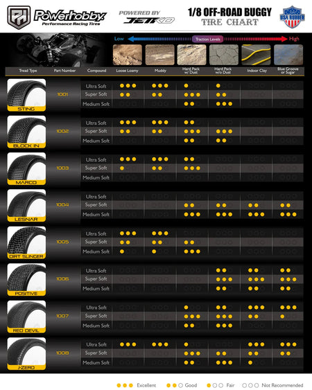 Red Devil 1/8 Buggy Tire was designed specifically for smooth and low grip tracks. The Red Devil features a pattern of small, tightly packed diamond and triangle shaped pins so you can lay down as much rubber as possible