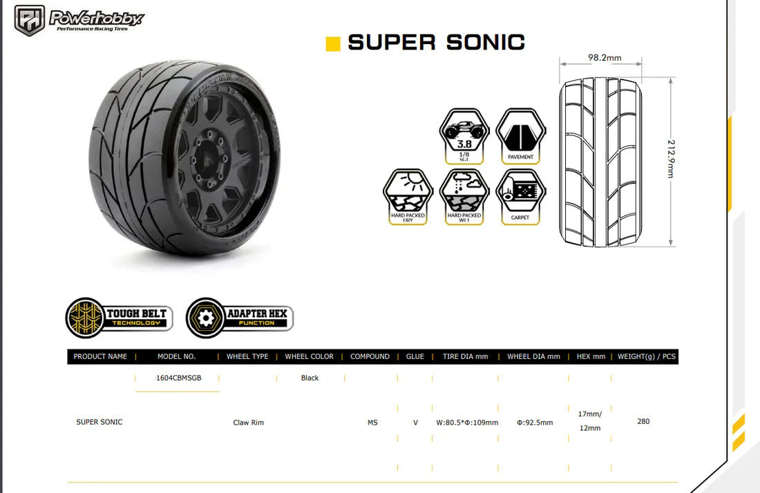 Power Hobby 1/8 SGT 3.8 Super Sonic Belted Mounted Low Profile Tires Removable Hex (2) 1604CBMSGB