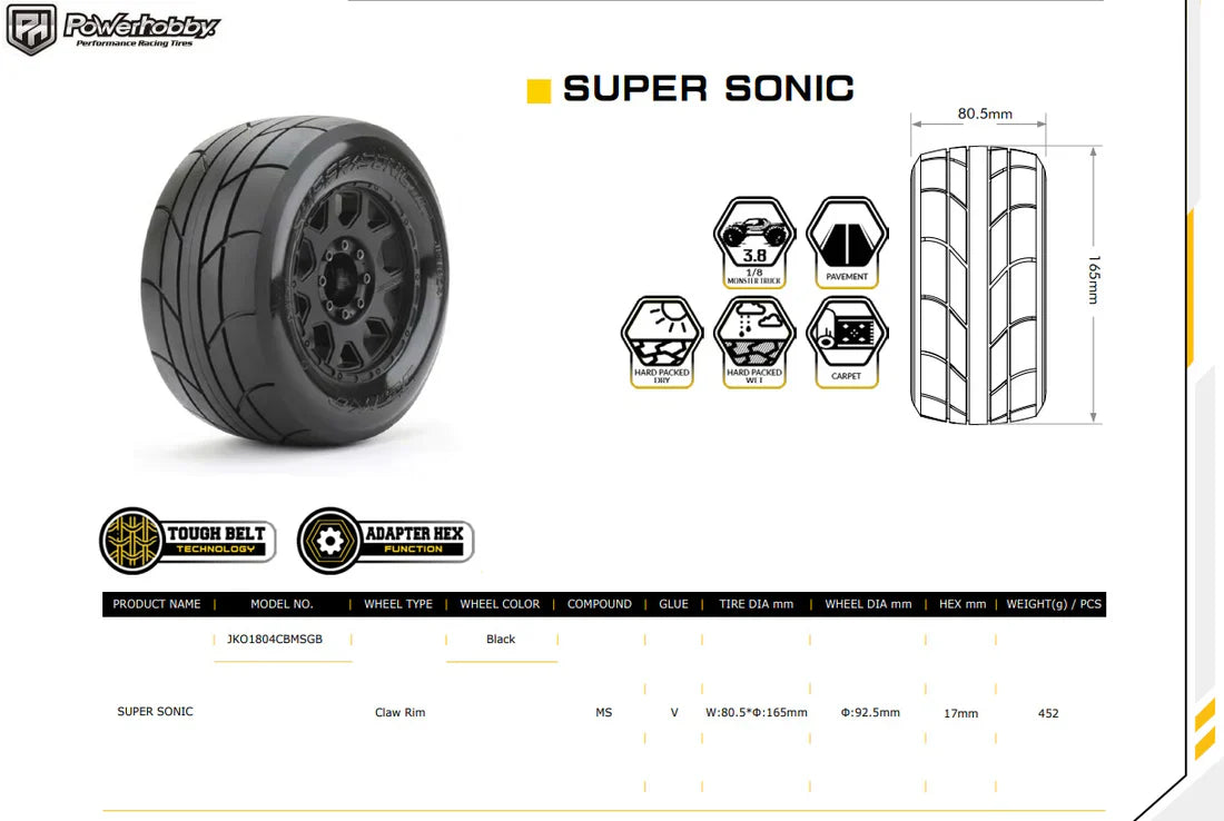 Power Hobby 1/8 MT 3.8 Super Sonic Belted Mounted Tires Removable Hex (2) 1804CBMSGB