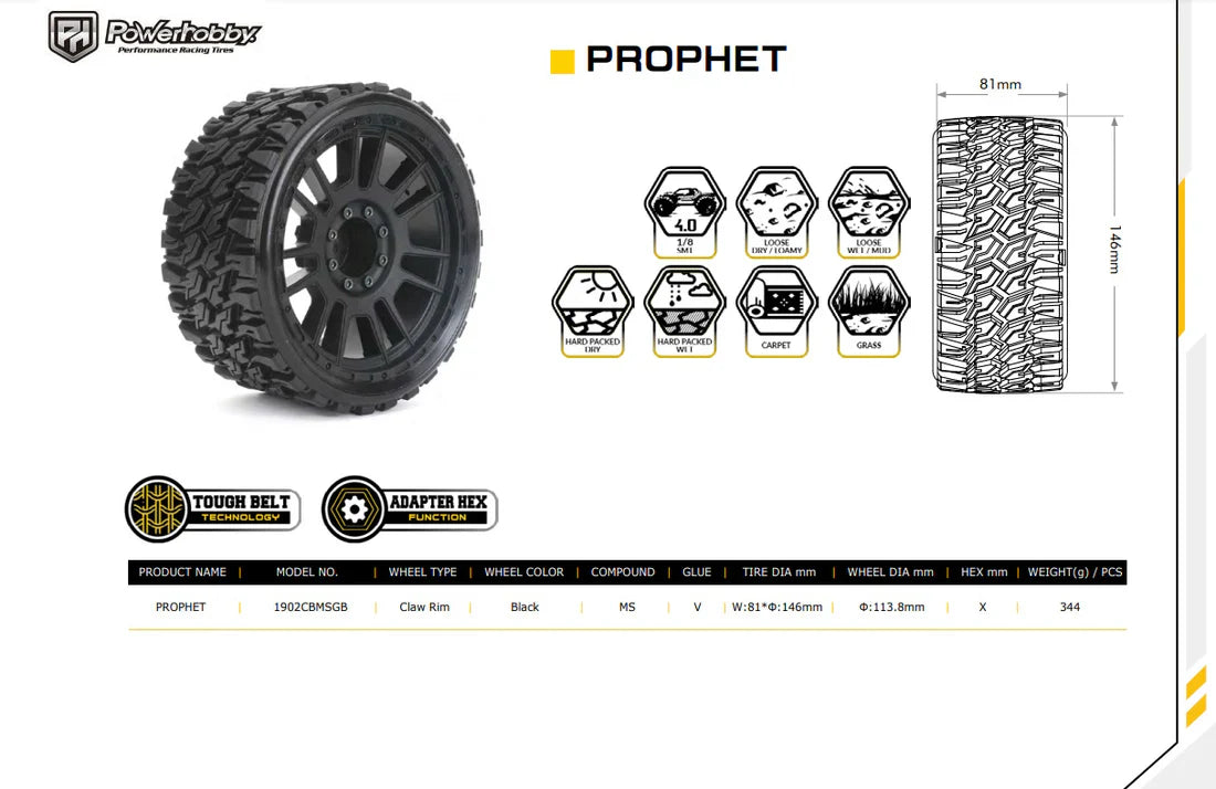 POWERHOBBY 1/8 MT 4.0 PROPHET BELTED MOUNTED TIRES W REMOVABLE HEX WHEELS (2)