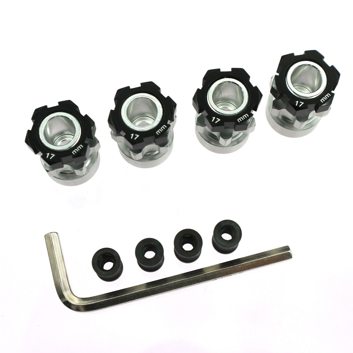 These adapters are compatible with most 1/10th vehicles with factory 12mm hex hubs. Allows the use of 17mm hex wheels, adding a 6mm width extension per side of the vehicle for a wider, more stable, stance.12mm hex to 17mm hex conversion
