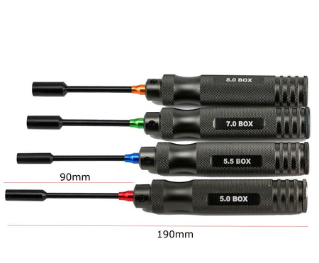 Tackle any RC maintenance or assembly job with this 4-Piece Nut Driver Wrench Set. The set features large, knurled handles that have both color-coded collar and machined indicators for quick driver size identification.