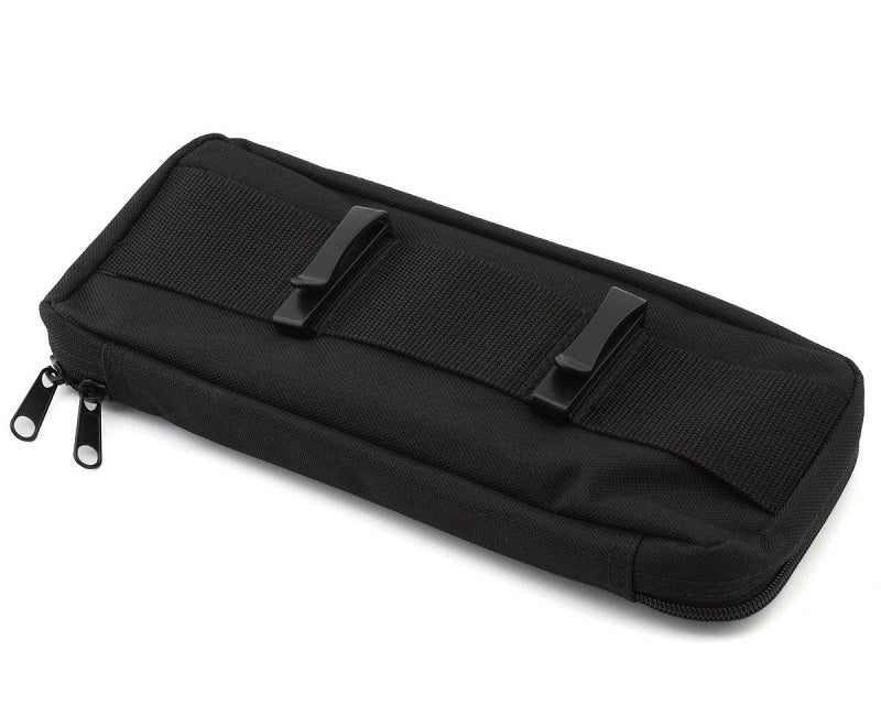 Constructed from heavy-duty fabric, this pack is built to withstand the rigors of the racing environment. Its compact design makes it easy to carry, while a zippered compartment and elastic straps securely hold your tools, ensuring nothing is left behind. The zippered pouch is perfect for storing small parts like glow plugs, and the additional elastic straps behind the zippered pouch are ideal for items like tuning screwdrivers or glow igniters. With belt clips included, this is a must have for any racer!