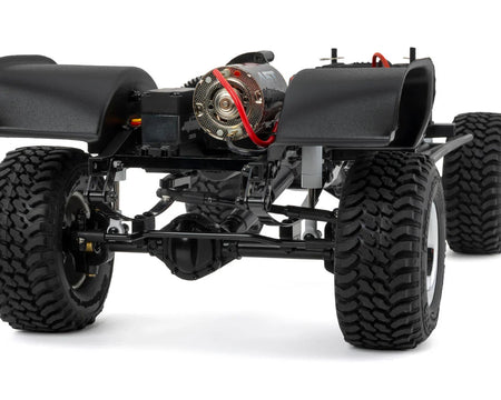 The core of this chassis is the well-known Trail Finder 2 Chassis. Starting from the ground up, the scale 1.9 BFGoodrich Mud Terrain tires are mounted to Rally 1.9 Beadlock Wheels. These wheels are mounted to RC4WD scale cast axles. A Key update to the chassis is the soft leaf springs for a more realistic driving experience. The suspension components are mounted to aluminum frame rails. The drivetrain uses a rugged metal gear transmission powering two durable driveshafts for smooth power delivery.