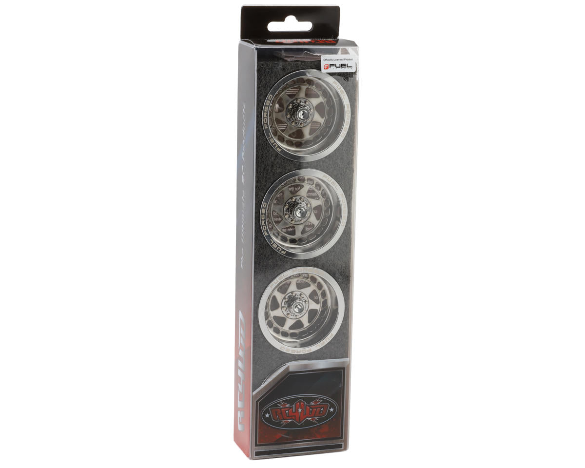 RC4WD Fuel Off-Road 2.2" Zillion Rock Crawler Beadlock Wheels. Replicated after the Fuel Off-Road 2.2" Zillion Wheels these officially licensed beadlock wheels are intended for 1/10 scale rock crawlers and trail trucks to enhance the scale realism and appearance of your rig. Constructed from CNC machined billet aluminum with a chrome plated finish, these wheels can hold up to extreme conditions and stay looking great while adding 354.4g of total unsprung weight to enhance stability and crawling performance! Equipped with a standard 12mm hex and compatible with most 1/10 scale rigs these are an excellent option when looking to upgrade.