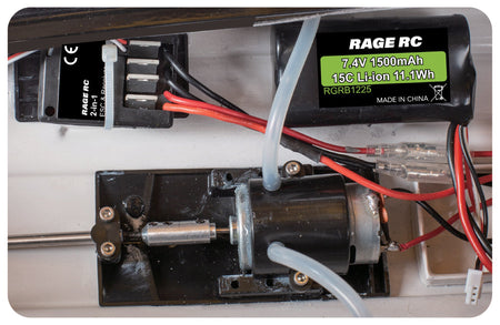 Like the original Black Marlin, the Rage RC Black Marlin EX will have you racing across your local pond or lake in no time. The EX's speed is generated by an installed powerful water-cooled 390-size motor in combination with the included 1500mAh Lithium Ion battery pack. The EX also includes important new features, like self-righting that allows the boat to automatically turn right side up after capsizing, and a reverse function to help get out of trouble if the boat ever gets into a tight corner and isn't able to turn around.