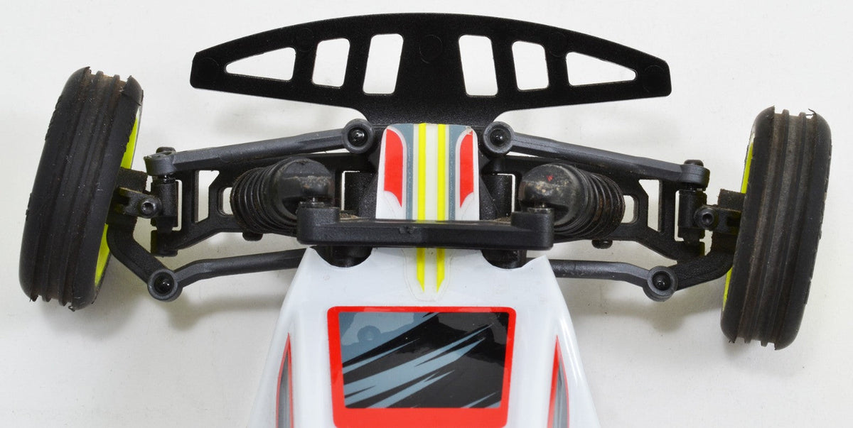 Out back, the stock setup leaves the chassis completely exposed. Our rear bumper is 1.5 (38mm) wide and extends rearward, protecting your Micro-B from overzealous friends attempting to drive through you! Additionally, our bumper extends forward too, creating a 1-5/16 (33.4mm) wide chassis skid plate out back.