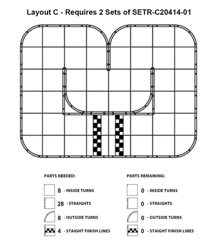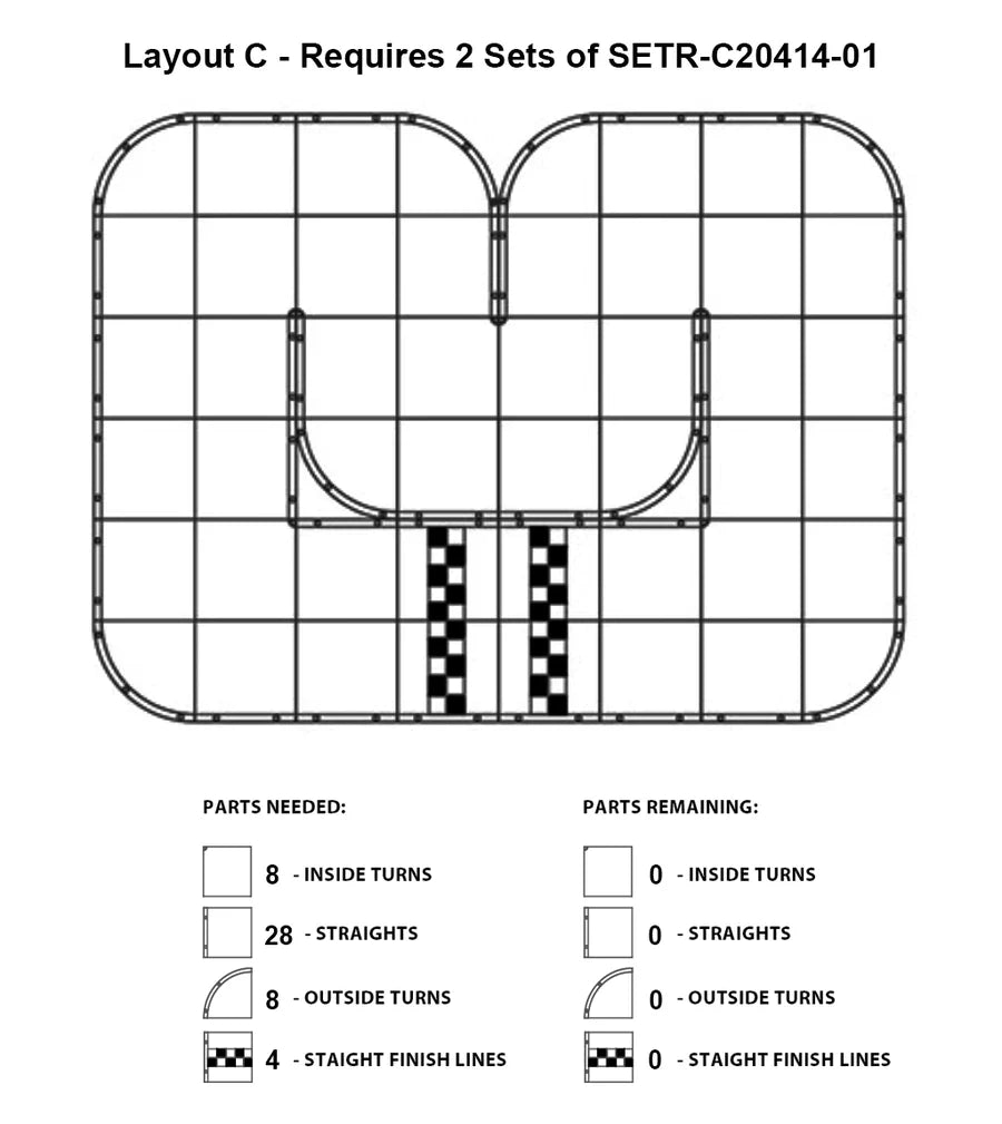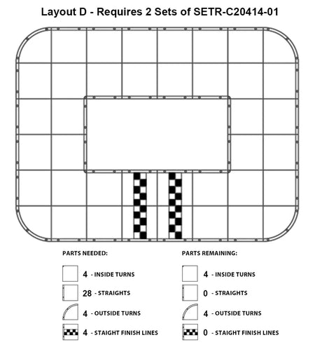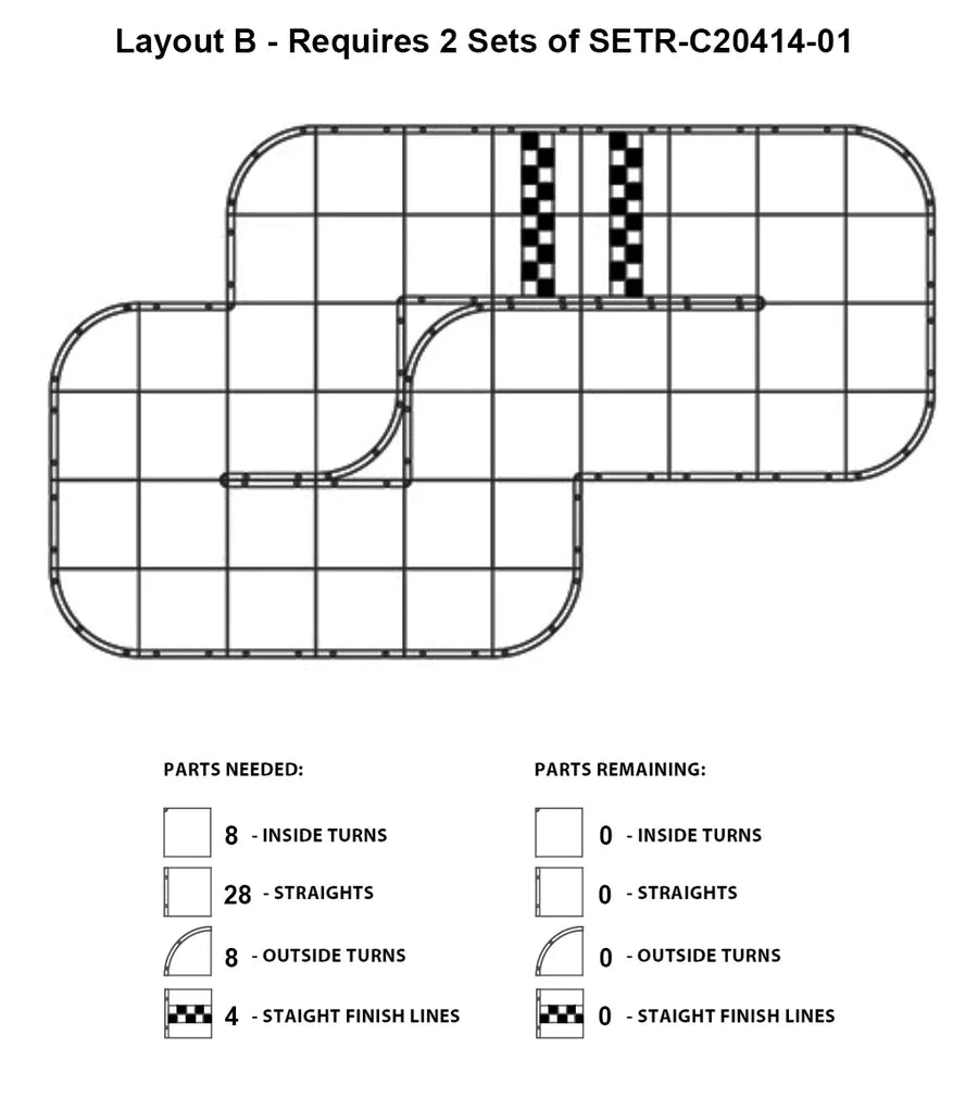 - Easy to calculate space required. Add up the number of tiles on each side of the track and multiply by 20” to figure total length and width of any layout.