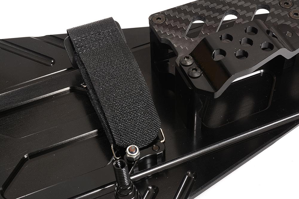 Add chassis stiffness and head turning anodized aluminum at the same time to your 1/10 Bandit with our Performance Conversion Kit! The stock molded chassis is replaced by an anodized aluminum lower deck that is milled out in strategic areas to lose dead weight without hindering chassis strength. A carbon fiber plate up front stiffens up the steering area, and Velcro battery straps hold your battery securely in place – no more accidental battery packs ejecting from the vehicle! Finally, the kit uses all countersunk hex head hardware.