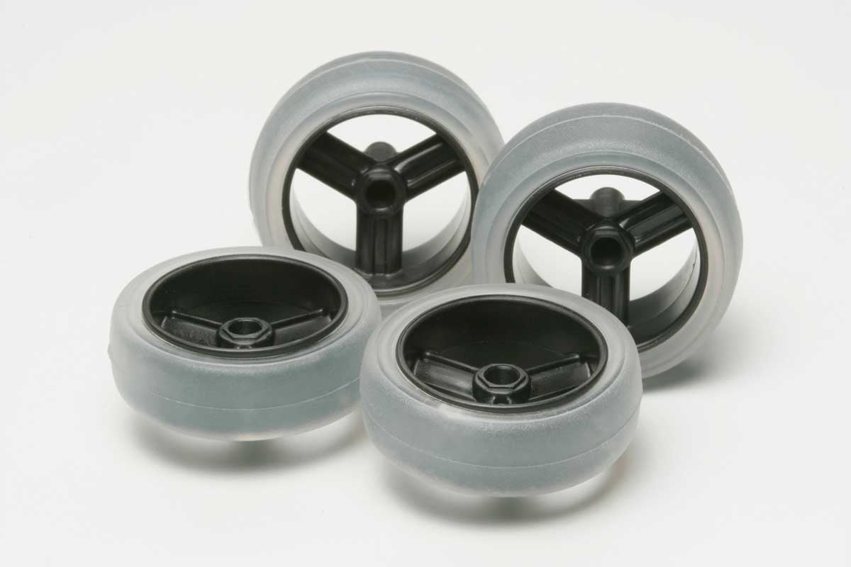 High-grip, clear-type soft slick tires mounted on black wheels made from nylon-reinforced, high strength polycarbonate material. A full set of 4 for one machine.