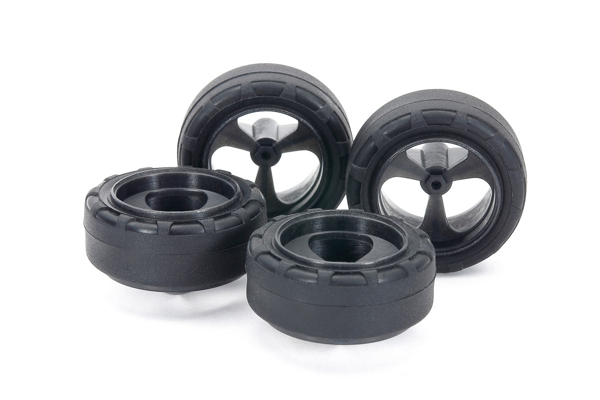 This tire set includes a combination of small diameter black low friction narrow tires (24mm) and 3-spoke carbon fiber reinforced wheels. Use them to fine tune your Mini 4WD machine to the track!