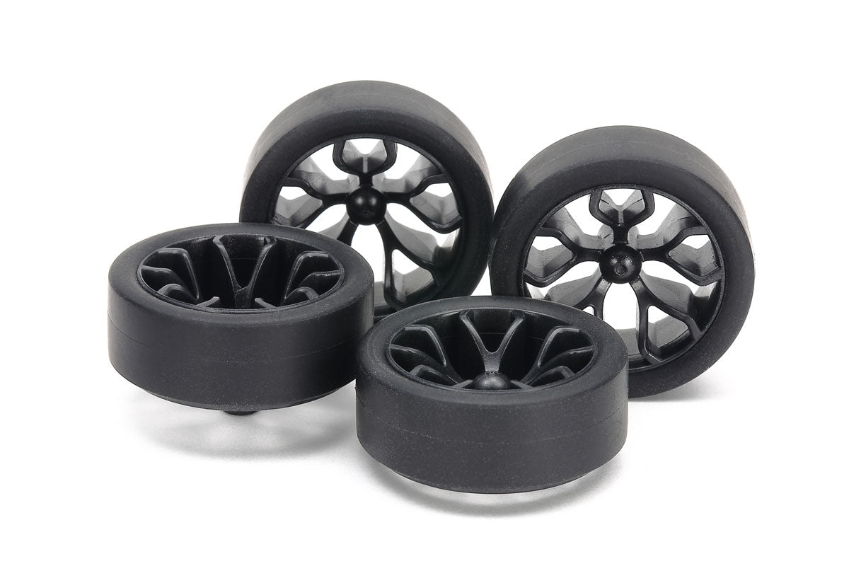 This tire and wheel combination set for Tamiya Mini 4WD cars features low-profile hard compound tires with Y-Spoke carbon reinforced plastic wheels.