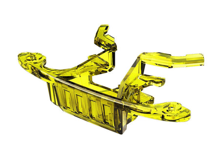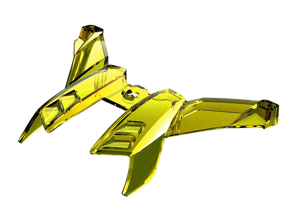 - The model includes the following three types of dedicated V parts (clear yellow ABS) which can be attached by screws: (1) 1-piece high-mount roller section angles rollers upward to lift up body rear (lower body front) and limit jumping in lane change sections. Also, the mount acts as side guard stabilizer for stable performance. (2) A front lower guard limits front bumper's deformation when cornering, and works as a brake on upslopes in lane change sections. (3) Taller rollers at front and rear feature 2mm higher attachment compared to regular rollers, to limit body lean. Their patterns are inspired by a western knight's shield.
