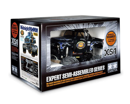 The Tamiya X-SA Midnight Pumpkin 2WD Electric Monster Truck Rolling Chassis Kit features an expert built chassis with pre-finished body that can be appreciated by both drivers and collectors alike.