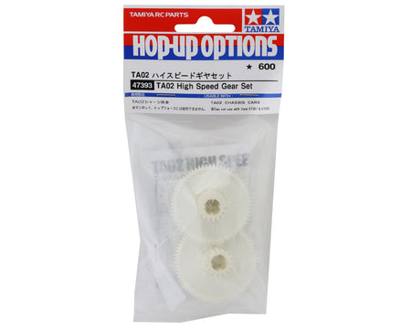 Tamiya TT-02 High Speed Gear Set. This is an optional gear set intended to make your TT-02 achieve higher speeds. Package includes two gears and three screws.