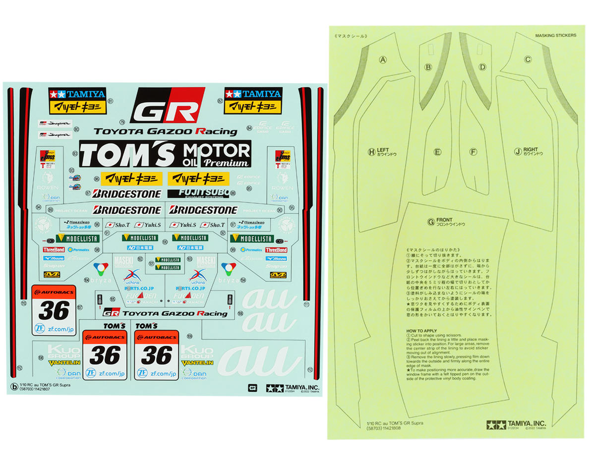 This is the Tamiya AU TOM's GR Supra Body with Parts Set. Constructed from durable 1mm thick polycarbonate this AU TOM's GR Supra Body body faithfully recreates this iconic racecar with an abundance of scale details. Included with this clear body is a parts set consisting of several molded body accessories, body clips, window masks and decals. Compatible with the TT-01, TT-01 Type-E, TT-02, TC-01, TA06, TA07, TA08 and TB-05 chassis cars, this is an excellent scale option for your next build.