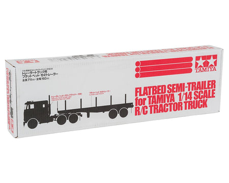 This highly realistic 1/14 scale flatbed semi-trailer model is for use in combination with Tamiya's 1/14 R/C tractor truck. A scale appearance is achieved by using authentic components such as aluminum chassis/frame, wood-floored platform and actual chains.