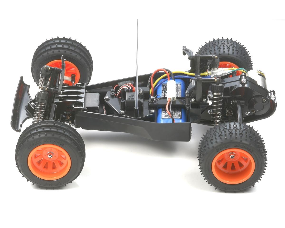 This tough, lightweight ABS bathtub chassis features a rear-mounted motor, rear-wheel drive layout. Fully-enclosed gearbox protects against dirt and debris and is equipped with differential gears to offer smooth cornering. 4-wheel independent double wishbone suspension is equipped with C.V.A. shock units and extremely durable monocoque-type lower arms. The front spiked tires feature three ribs for enhanced stability while the rear tires feature both spikes and an X-shaped tread pattern along the center to ensure high levels of grip.