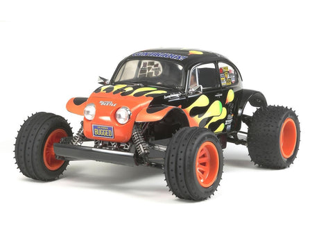 This is the Tamiya 1/10 Electric Blitzer Beetle 2011 Off-Road Kit, a 1/10 scale R/C assembly kit of the Blitzer Beetle, which was inspired by the exciting off-road desert racer designs seen in the United States. This chassis is equipped with 4-wheel double wishbone suspension, CVA shock units, and high-grip off-road tires to offer superb driving performance on rough terrain. The injection-molded body features metal-plated light covers and side mirror parts for greater realism.