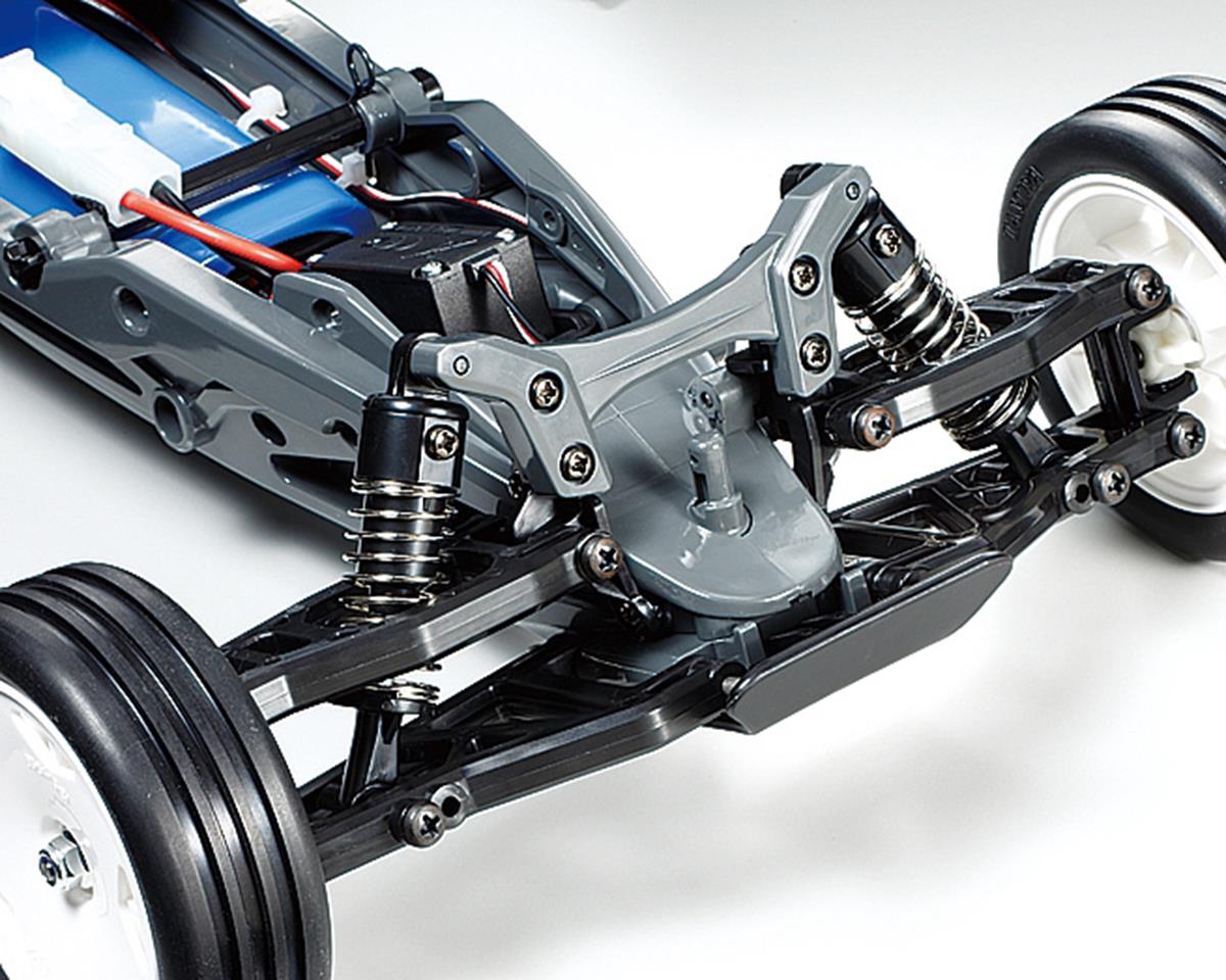 The slim form of the DT-03 chassis stems from the lightweight yet durable monocoque frame, which features a longitudinally-positioned battery and radio equipment along the centerline for excellent balance. The combination of a long 287mm wheelbase and 4-wheel double wishbone suspension married to long arms, allows the model to handle with stability on poor surfaces. Ribbed front and square spike rear tires provide ample grip, and the rear-positioned gearbox is sealed to protect from dust and dirt, with the built-in differential gear offering smooth cornering.