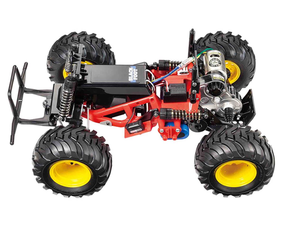 This is the Tamiya Blackfoot 2016 Edition 2WD Electric Monster Truck Kit. This truck is the modern successor to the Blackfoot line of trucks starting in 1986. It features the classic body from the Blackfoot III kit and it is mounted on the chassis used in the Monster Beetle (2015) radio control model. The chassis is an all-action 2WD machine fitted with big tires for rough-and-tumble off-road fun. The Blackfoot R/C model is ideal for great fun for both beginners, collectors and Tamiya connoisseurs alike. This specific kit includes a Hobbywing THW-1060 ESC for incredible performance.